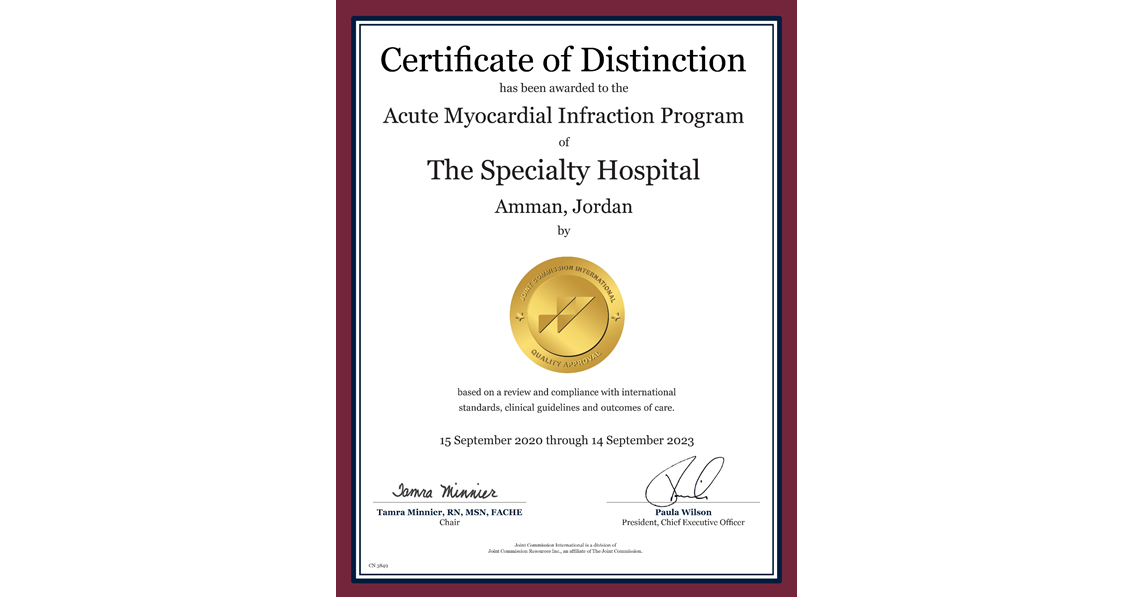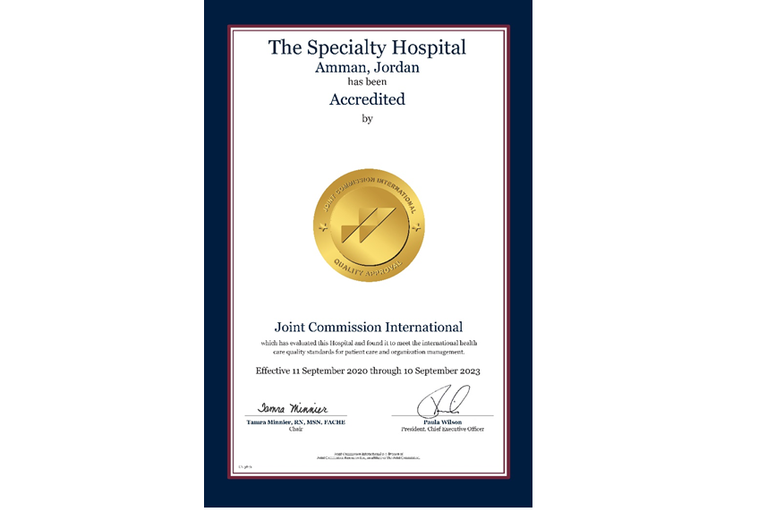 ومن الجدير بالذكر ان المستشفى التخصصي معتمد اعتماد كامل من هيئة الاعتماد الدولية منذ عام 2008 وهو أول مستشفى في الأردن والسابع في العالم الذي يتم اعتماده كمركز متميز في معالجة امراض القلب والحاصل على شهادتي قصور عضلة القلب واحتشاء عضلة القلب من قبل هيئة الاعتماد الدولية JCI منذ عام 2017.