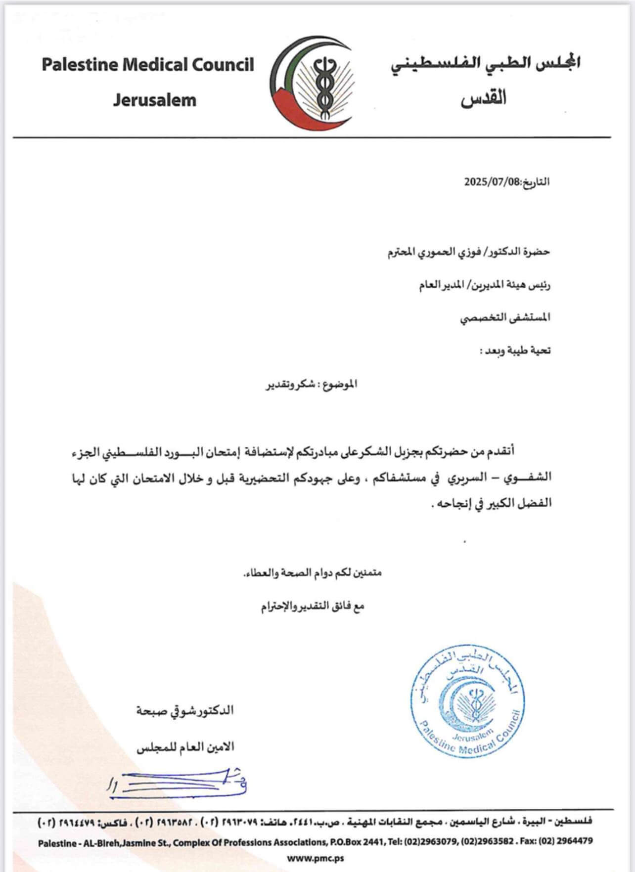وتتقدّم إدارة المستشفى التخصصي بجزيل الشكر والتقدير إلى المجلس الطبي الفلسطيني – القدس على ثقتهم باعتماد المركز التخصصي للتدريب مركزًا معتمدًا لعقد هذا الامتحان، كما تعبّر عن اعتزازها بكتاب الشكر الذي تلقّته من عطوفة الدكتور شوڤي صبحه – الأمين العام للمجلس الطبي الفلسطيني، والذي نعتبره تقديرًا لكل الجهود المبذولة من كوادرنا الطبية والإدارية، ويأتي هذا التعاون من قبل إدارة المستشفى التخصصي كجزء من الدعم المستمر للأشقاء في فلسطين.