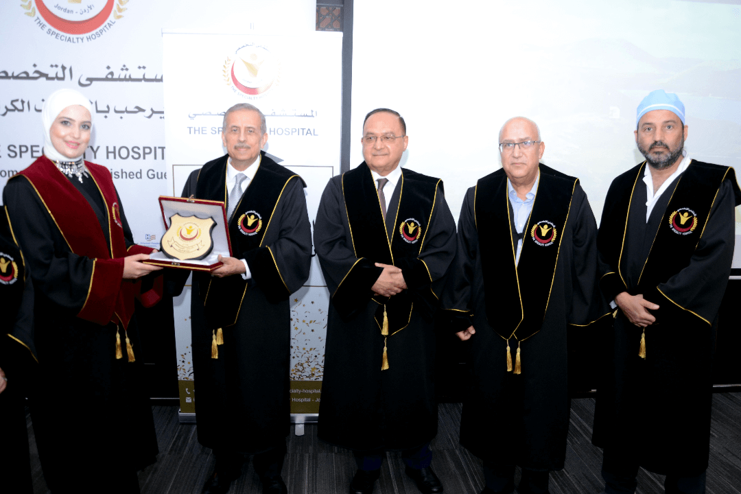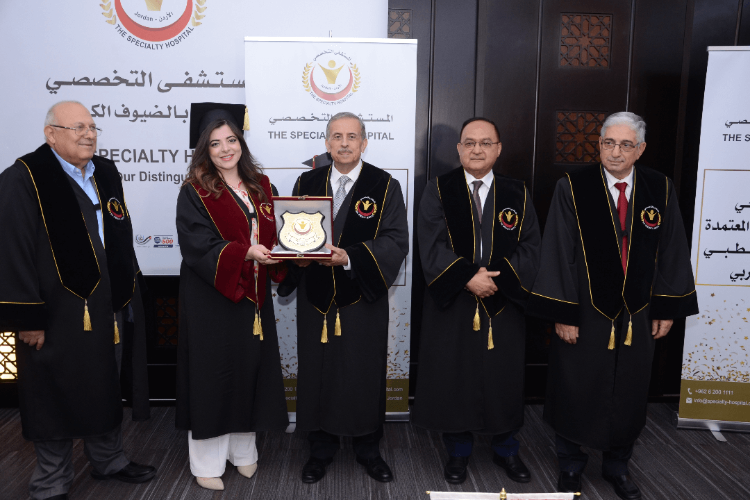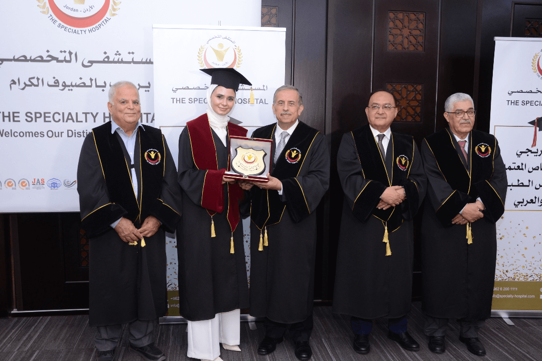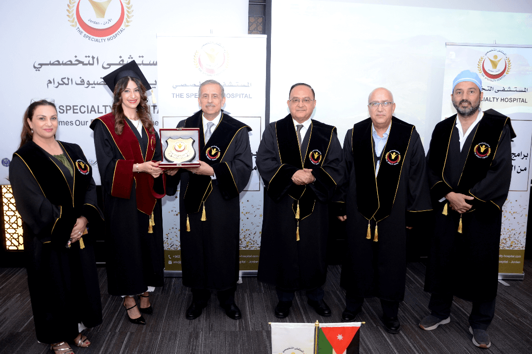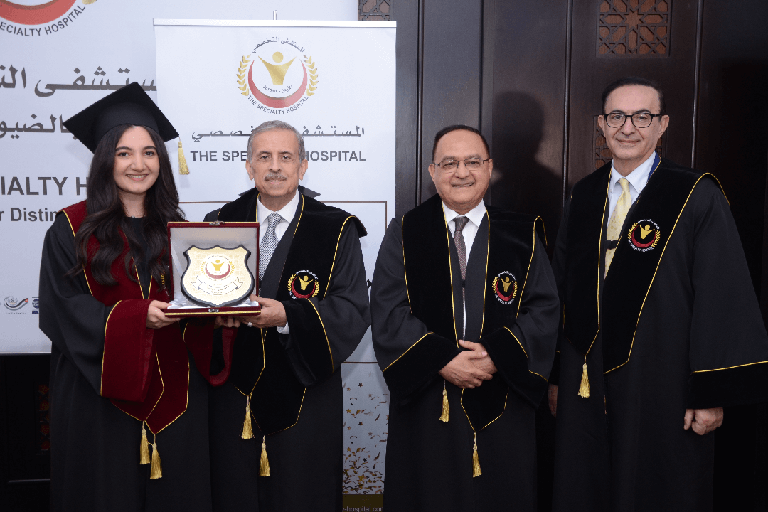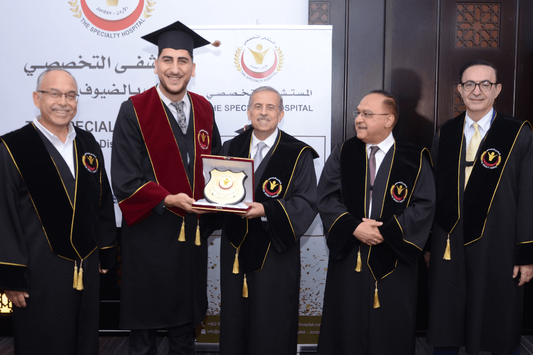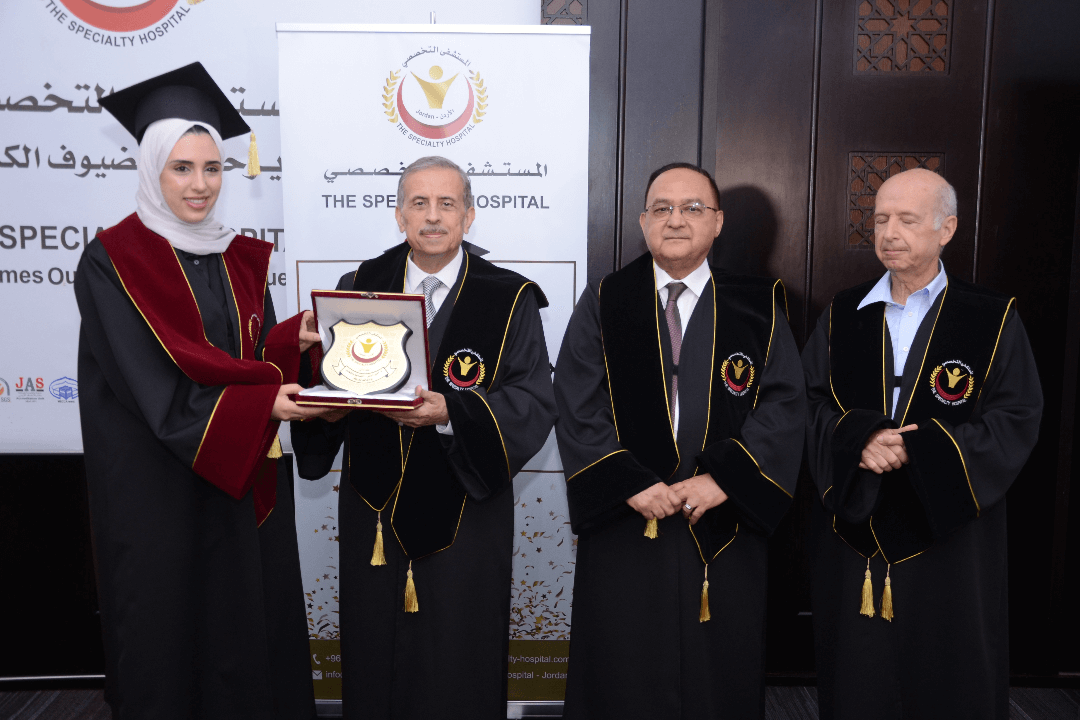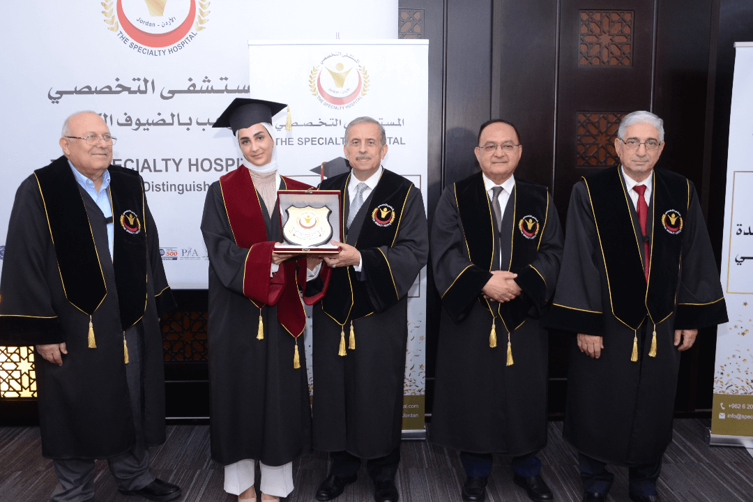 وتقديراً لجهودهم وتميزهم، تقدم رئيس هيئة المديرين والمدير العام للمستشفى، الدكتور فوزي الحموري، بالتهنئة للخريجين، مثمناً ما بذلوه من اجتهاد في سبيل اعتلاء سلم النجاح، والانطلاق في مسيرة خدمة الإنسان ورعايته في واحدة من أنبل المهن الإنسانية. وقد قام الدكتور الحموري بتسليم الدروع التذكارية للخريجين، داعياً إياهم إلى الاستمرار في العطاء، وبذل المزيد من الجهد في تقديم خدمات طبية نوعية للمرضى من الأردن والدول العربية، بما يسهم في رفع اسم المستشفى التخصصي والأردن عالياً على المستويات المحلية والإقليمية والعالمية.
