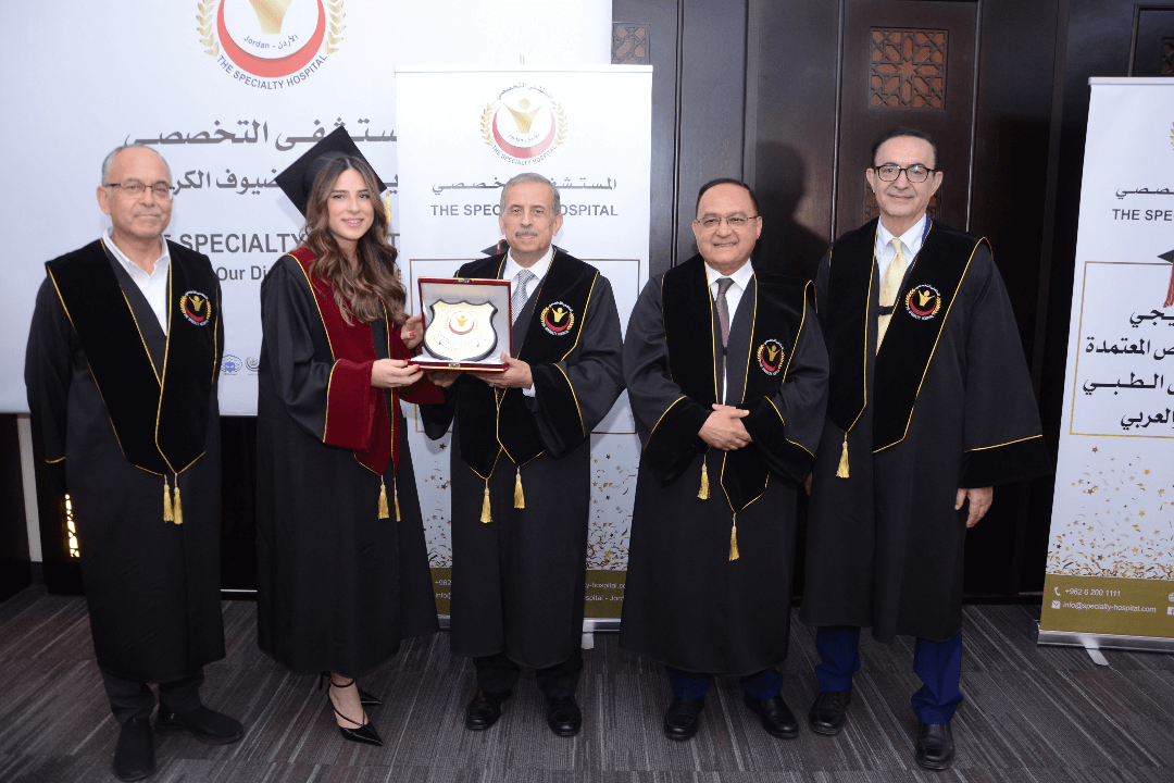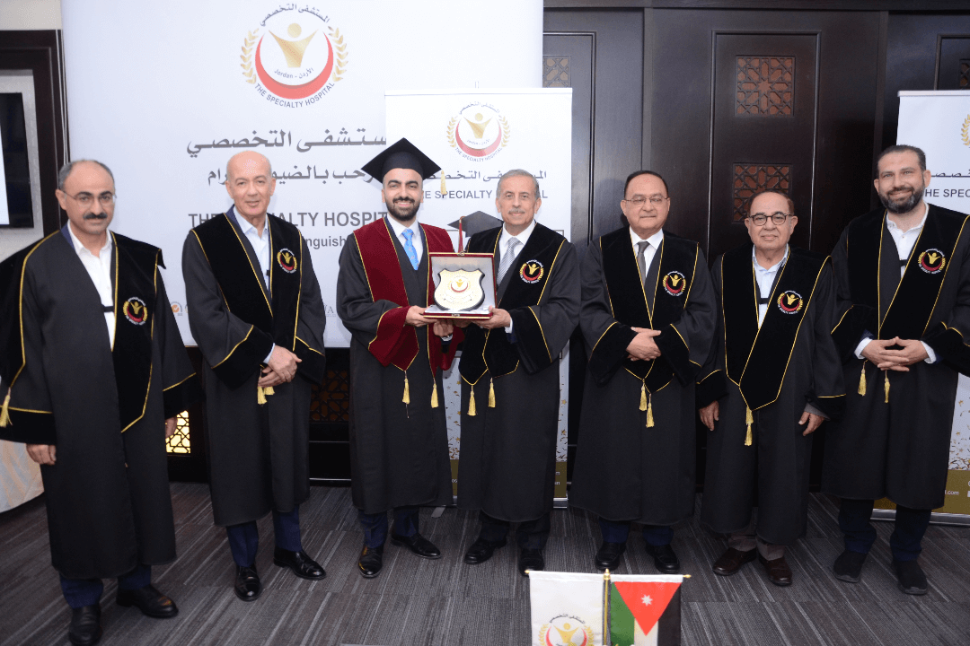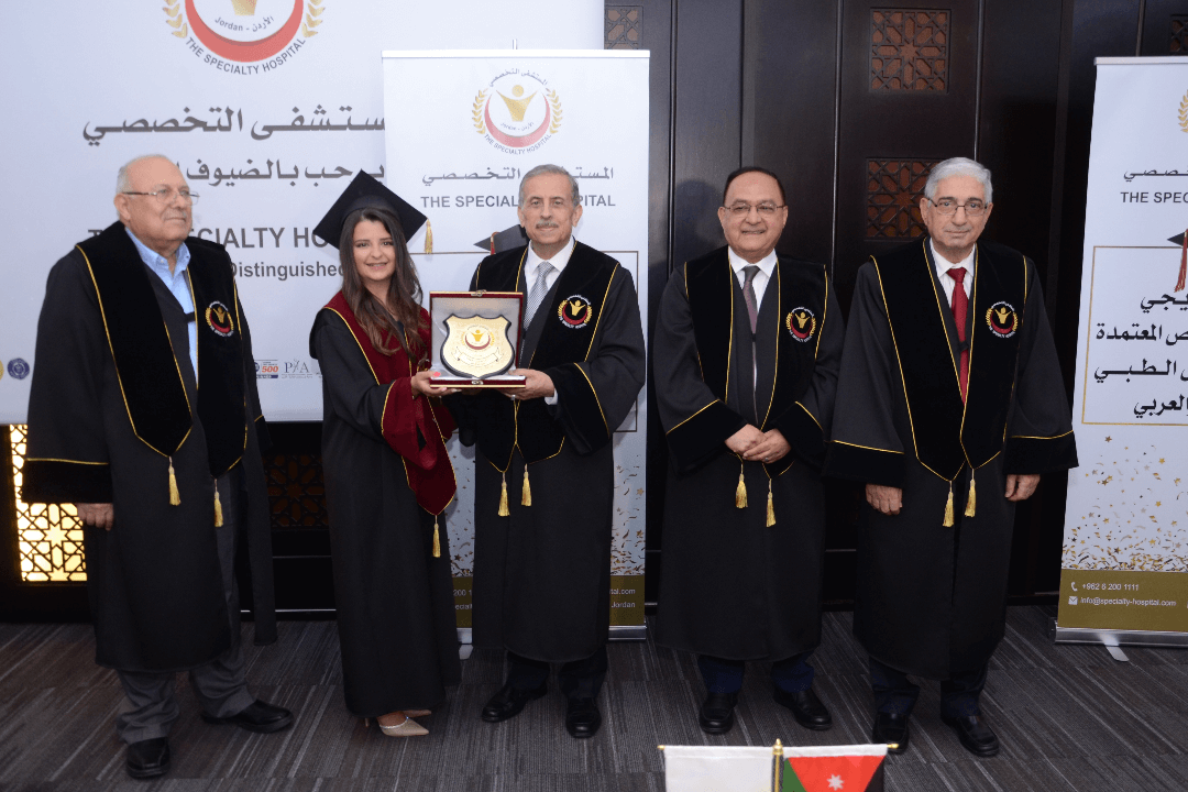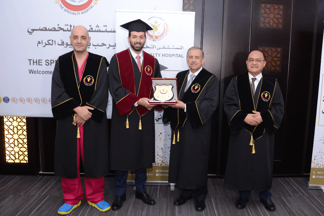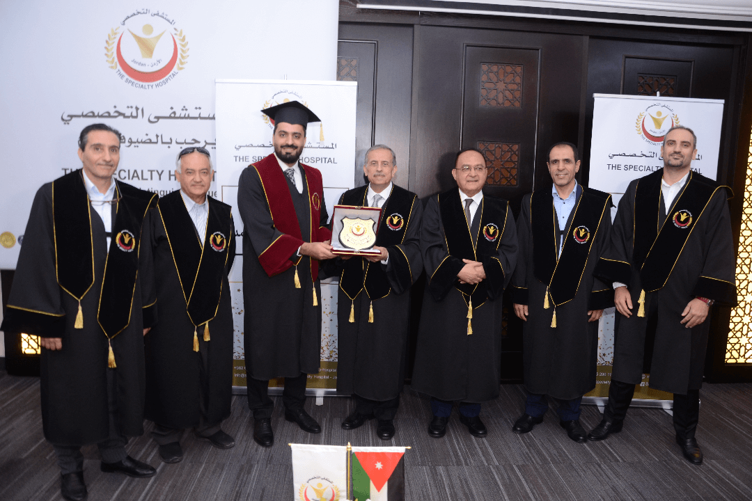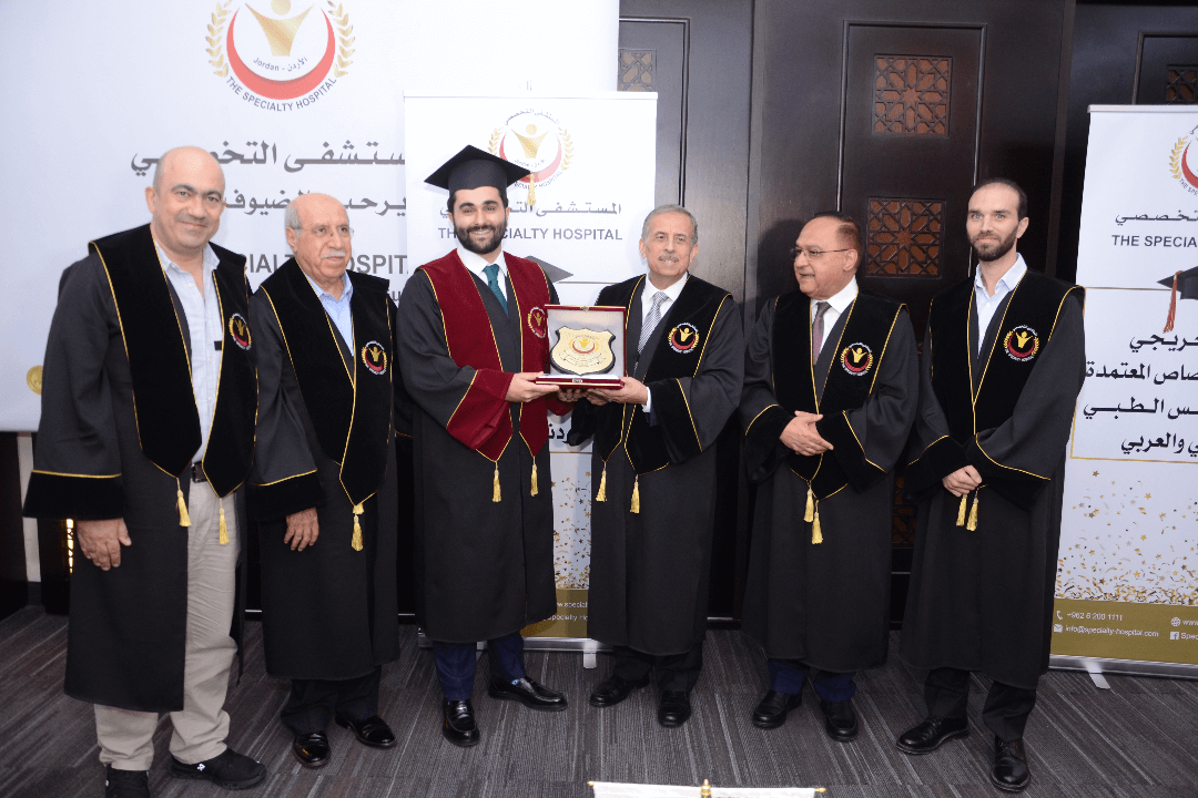 ويفخر المستشفى التخصصي بأن عدد الأطباء المستفيدين من برنامج الاختصاص منذ انطلاقته كمستشفى تعليمي عام 2006 قد تجاوز 475 طبيباً وطبيبة من الأردن ومختلف الدول العربية. وبهذه المناسبة، تتقدم إدارة المستشفى بالتهنئة للخريجين وذويهم، وبجزيل الشكر والتقدير لأعضاء الهيئة التدريسية على عطائهم وجهودهم المتواصلة، سائلين الله لهم دوام التوفيق والنجاح. وسيبقى المستشفى التخصصي، بإذن الله، منارة للعلم والعمل المخلص تحت ظل حضرة صاحب الجلالة الهاشمية الملك عبد الله الثاني ابن الحسين المعظم، حفظه الله ورعاه.